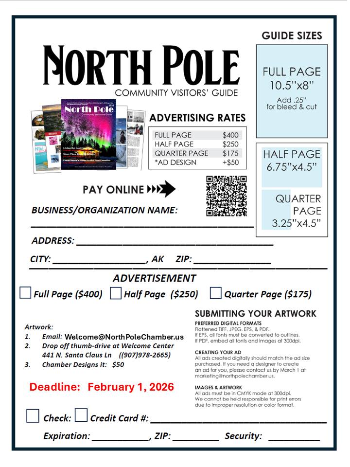 Click “Greater North Pole Community Directory” above to download or print the booklet. Or click “Master North Pole Business Directory List” to download the master list.