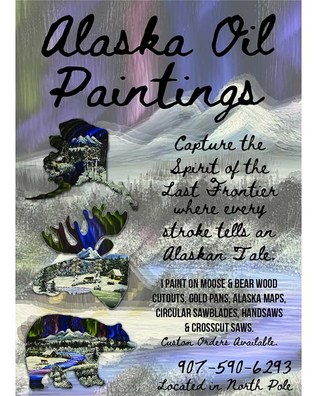 Local Artist featuring unique Alaskan paintings with cut outs of moose and bear. Beautiful Alaskan scenes painted on saw blades and painted ornaments.